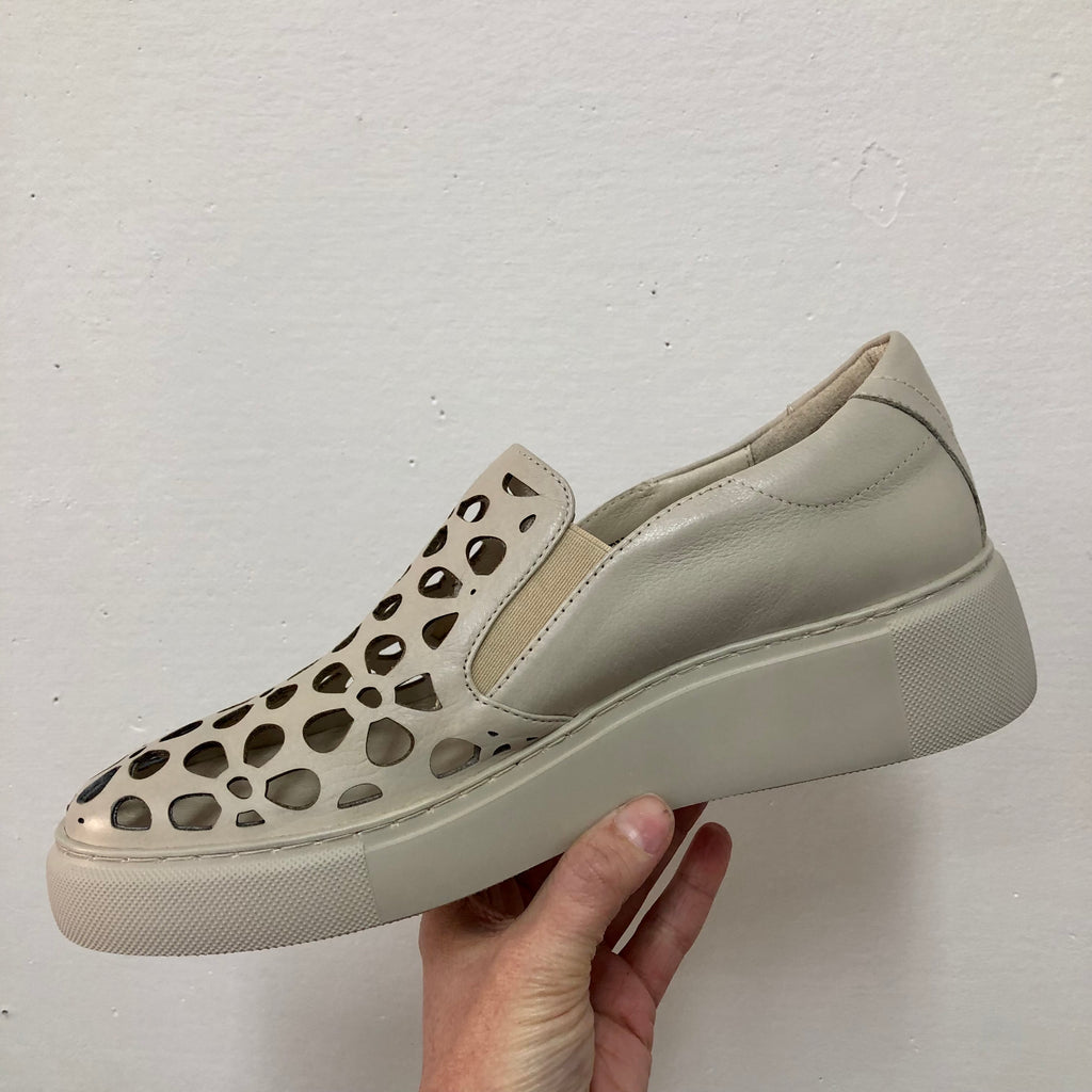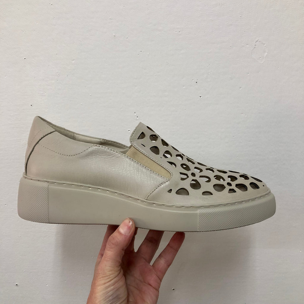 As an expert in the footwear industry, I introduce to you the Django and Juliette Yarty ~ Almond ~ Leather. Made with genuine leather, these slip on shoes feature an elastic gusset for a snug fit and a floral laser cut out design that allows your feet to breathe. Experience comfort and style like no other.