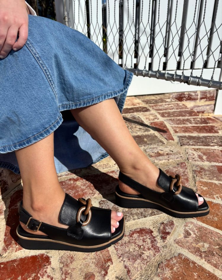Django & Juliette Kameli combines modern style with comfort in a sleek slingback design. Crafted from premium leather, this shoe features a chunky detail and secure buckle fastening for a confident fit. Its thoughtful construction ensures great coverage and all-day comfort, making it ideal for summer wear without compromising on elegance.