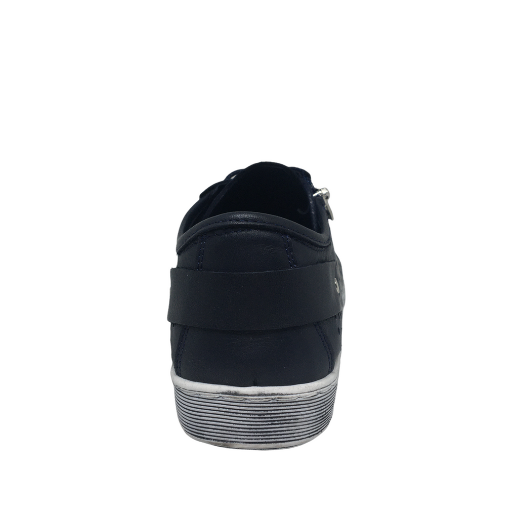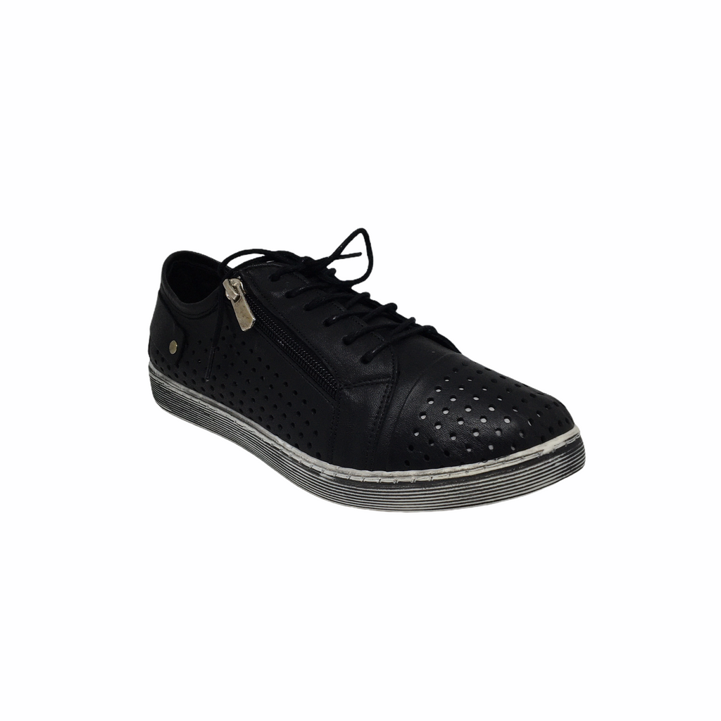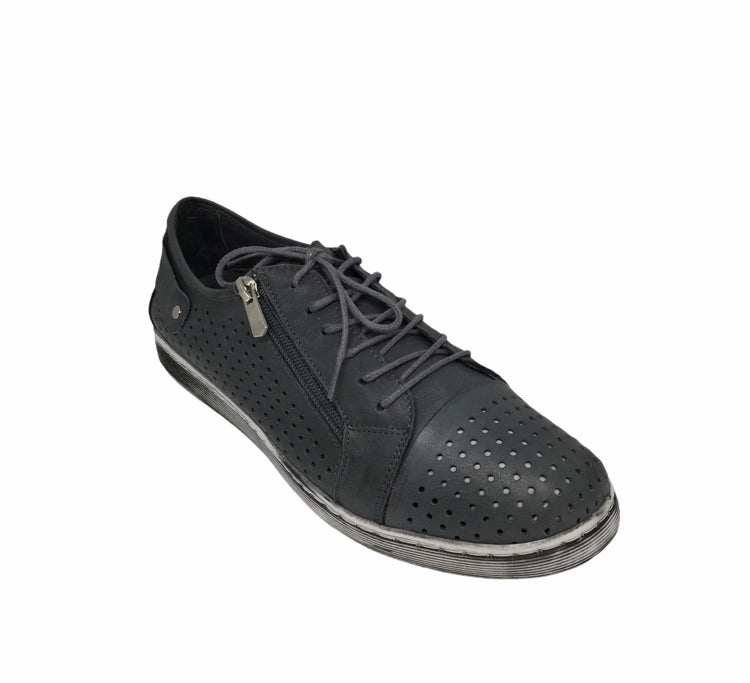 Comfort leisure shoe with feature detailing uppers and zipper, laceup closure, wider fitting, removable innersole - orthotic friendly. Leather uppers.