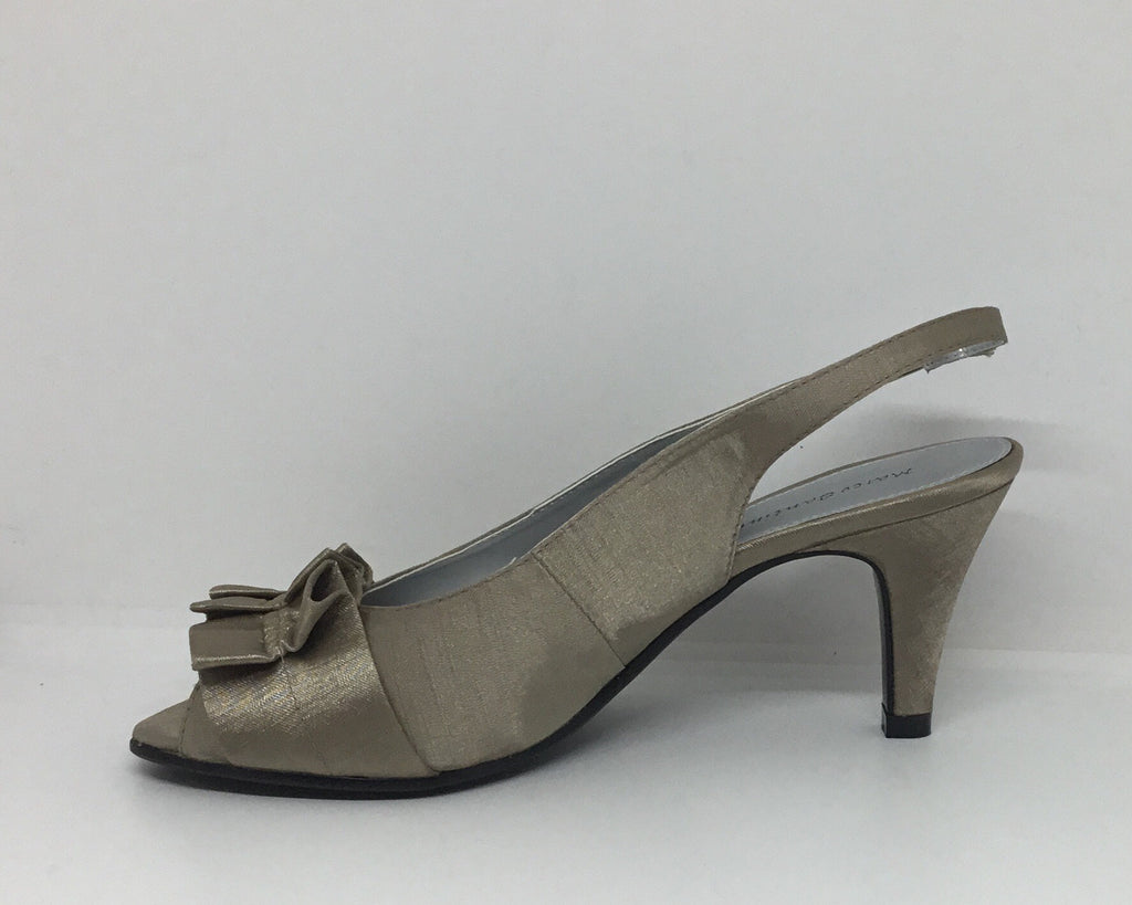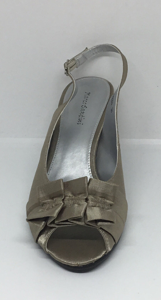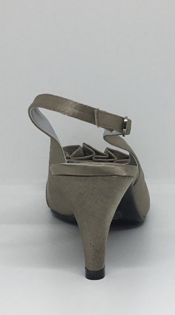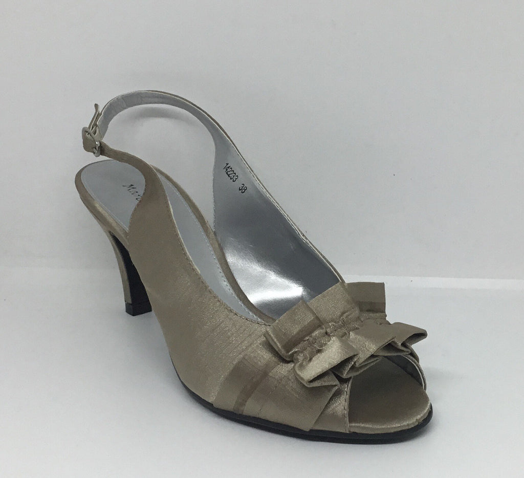 MID HEEL, PEEP TOE, SLING BACK, SANDAL, SATIN UPPER & LEATHER LINING