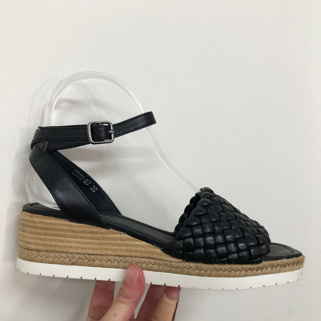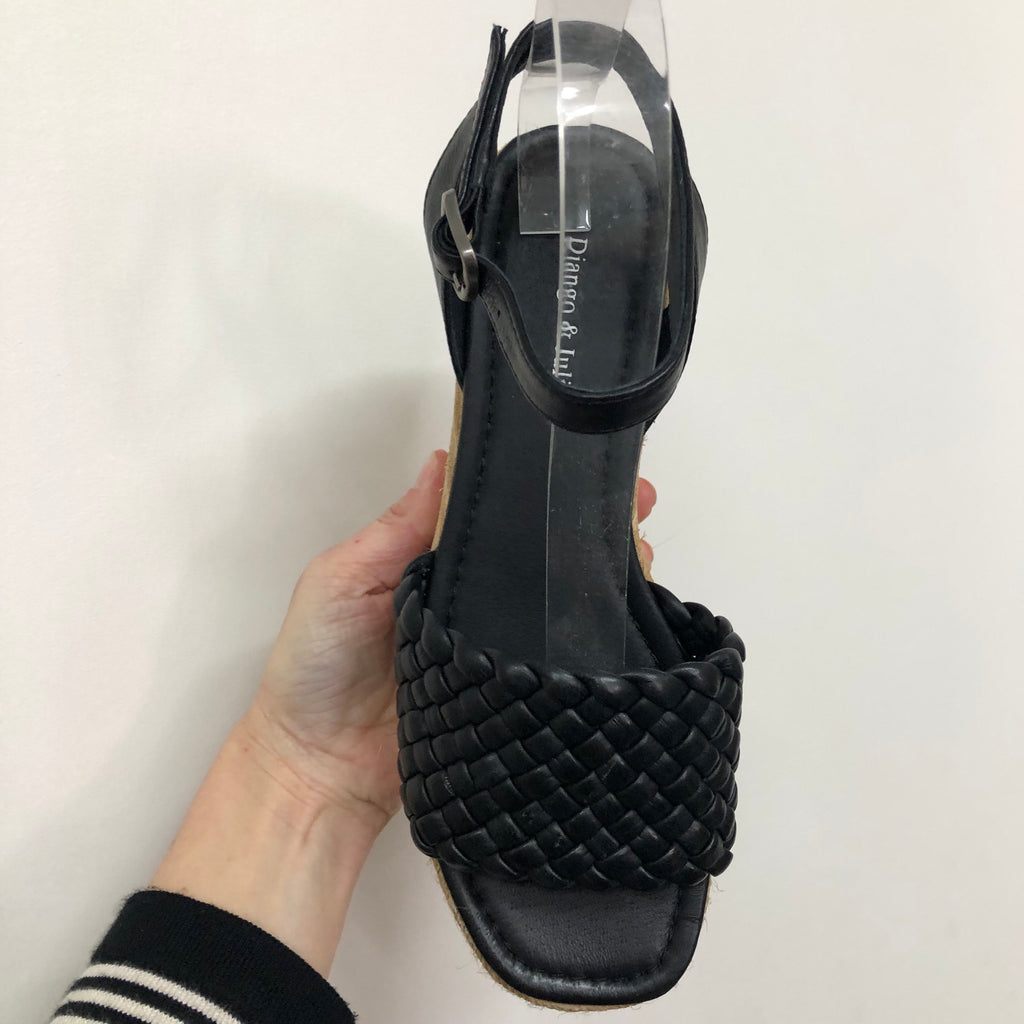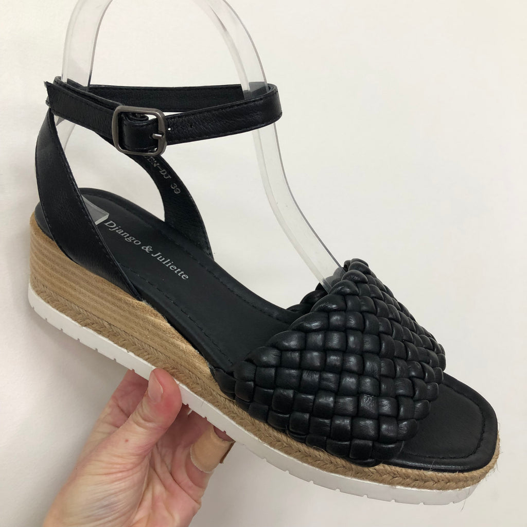 The Django & Juliette Iben ~ Rose ~ Black ~ Leather sandals are the perfect way to add a touch of sophistication to any outfit. Crafted from premium leather, these sandals feature an ankle strap and buckle closure for a secure fit. The woven pattern and low heel provide timeless style and lasting comfort, making them perfect for all day wear.