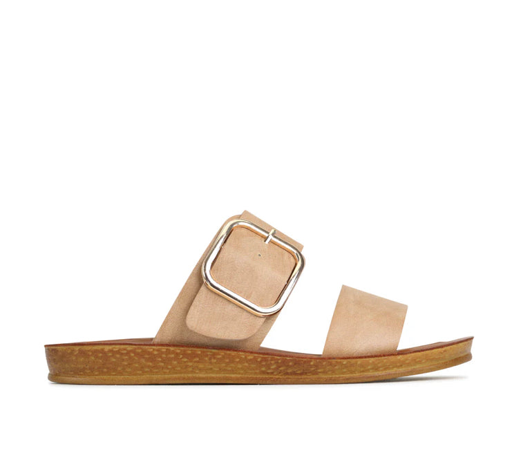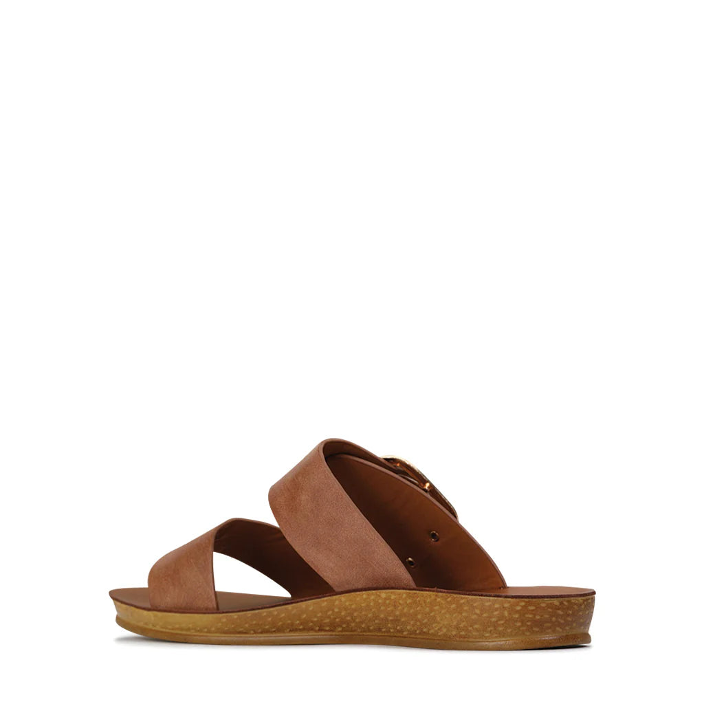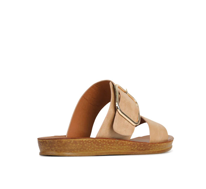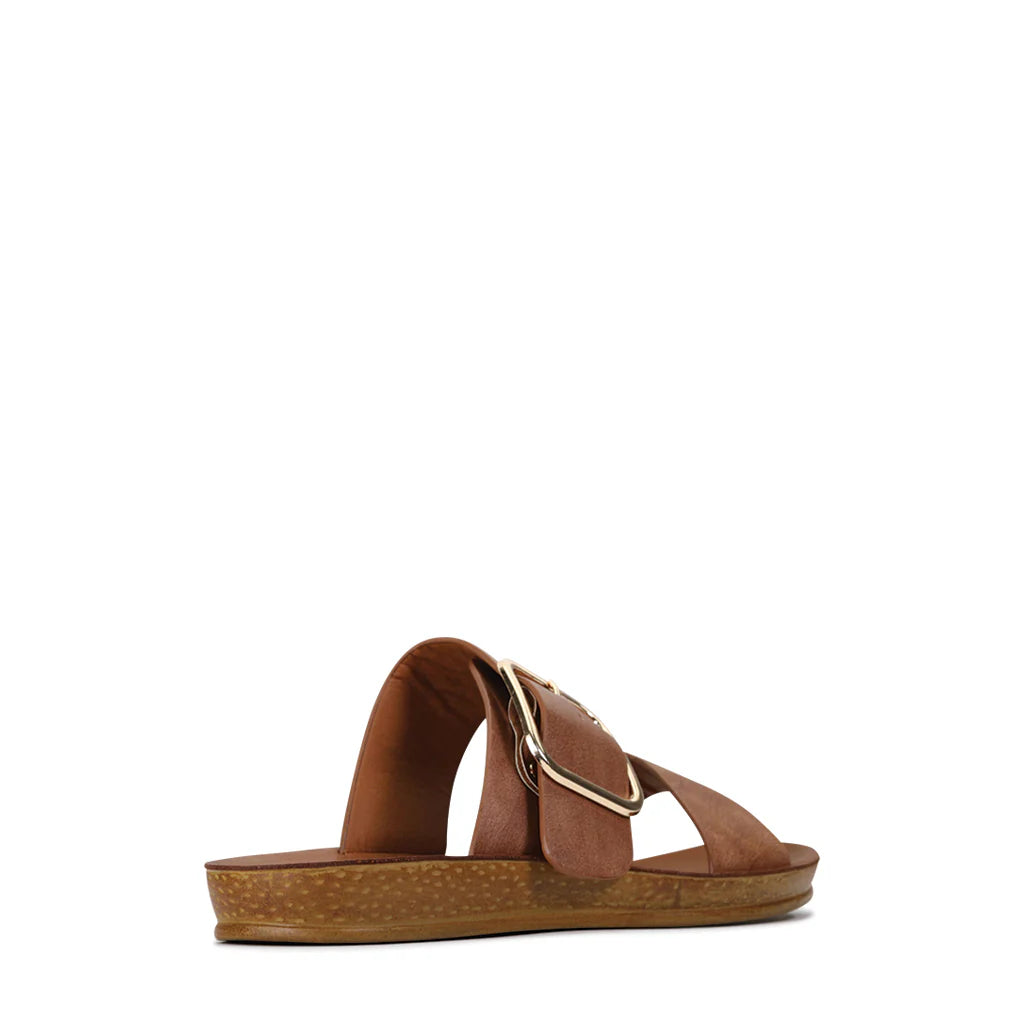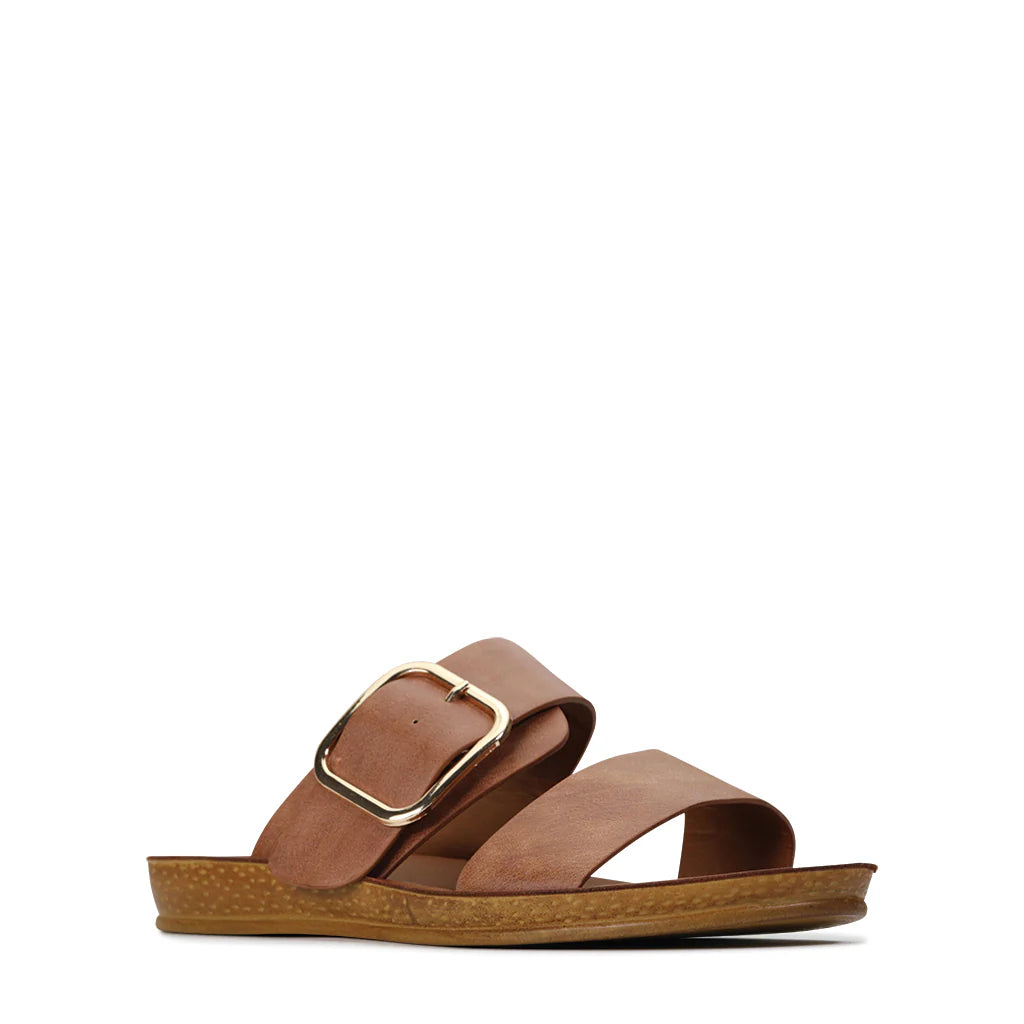 Elevate your wardrobe with the Los Cabos Doti in Camel or Chocolate, designed for fashion lovers who value comfort and style. This slide features a bold, oversized buckle that adds a statement touch while ensuring a secure fit. Its timeless camel color effortlessly complements any outfit, making it a versatile addition to your collection. Perfect for everyday wear, the Doti combines expert craftsmanship with enduring design for lasting appeal.