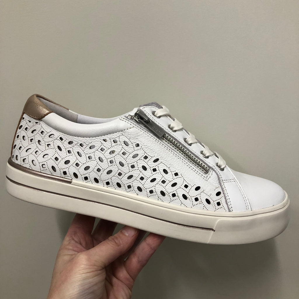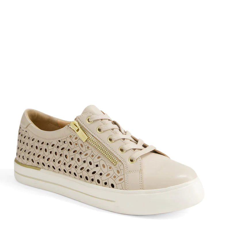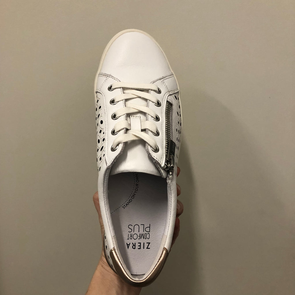 Part of the Ziera Lite range featuring a lightweight rubberised EVA sole, AYLEEN is a modern sneaker crafted from premium leather in a laser cut finish with a lace-up front and edgy zip trim. It includes two different sets of laces to customise your look! The pair are fitted with a removable Comfort Plus footbed to promote optimal alignment and a natural stride, easily switched out for personalised orthotics. A gel lining offers extra shock-absorption, while a TPU cradle supports and cups the foot from heel to arch. This style features the Ziera XF fit, allowing the fit to be customised by adding, layering or removing the included forefoot inserts.